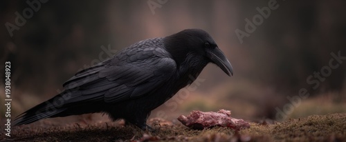 Naklejka premium The raven dances with death as it feeds on carrion ground feast.