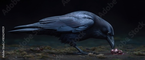 © ckybe, Fototapeta premium The raven scavenges carrion lying on the ground.