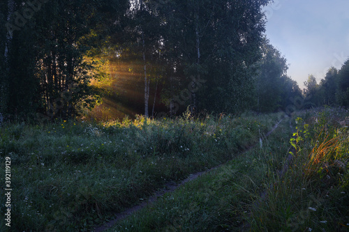 © Romulenoc 777, Naklejka premium The rays of the dawn sun make their way through the trees in the forest in the fog