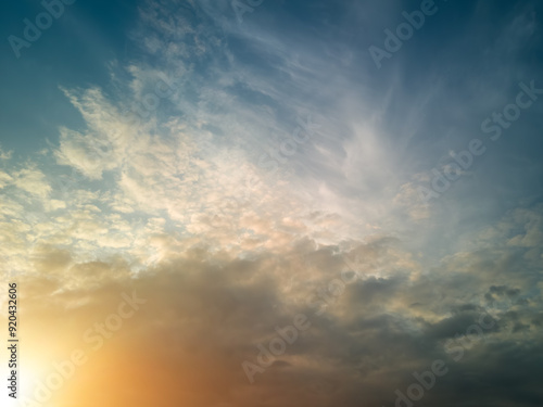 Naklejka premium The rays of the sun breaking through the dramatic clouds in the evening or in the morning in the sunset or sunrise sky.