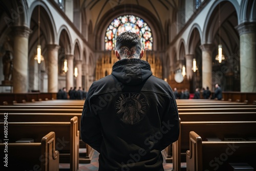Fototapeta premium The rear view of a tattooed person in a church pew, deeply immersed in prayer, symbolizing the unity of diverse spiritual practices.