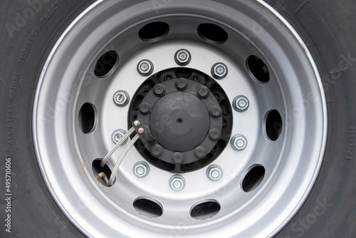 © rostovdriver, Obraz premium The rear wheels of a clean truck with new tires. Radial tubeless tires. Trucking concept