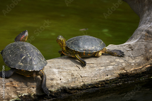 Obraz premium the Red-Eared Slider (Trachemys scripta elegans), a freshwater turtle known for the signature red streak behind each eye. A skilled swimmer and a sunbathing expert.