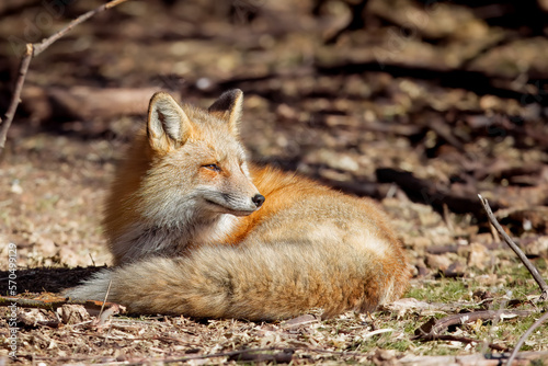 Fototapeta premium the red fox curled up and looking into the morning sun