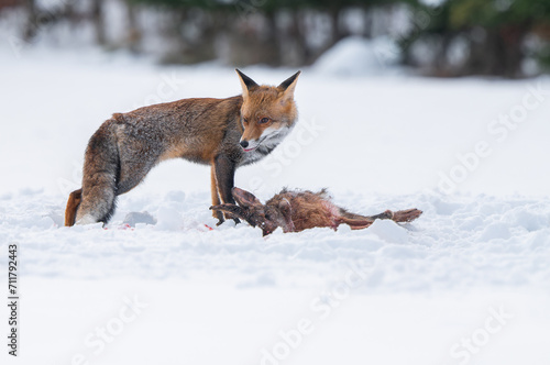 © Petr, Fototapeta premium The red fox with her prey caught hare in winter scenery