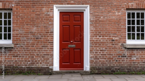 Fototapeta premium The red front door stands out against the old brick wall, framed by white...