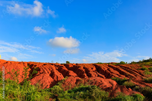 Naklejka premium The red land is under the blue sky and white clouds.
