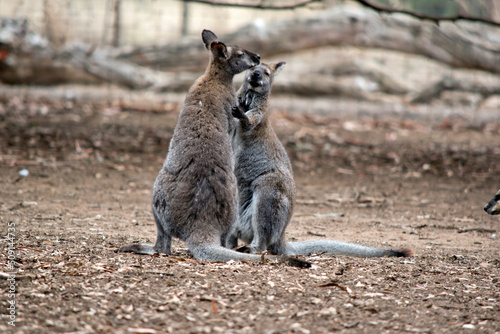 Naklejka premium the red necked wallabies are mainly grey with a reddish brown on the back of their necks black paws and black tips on their tails