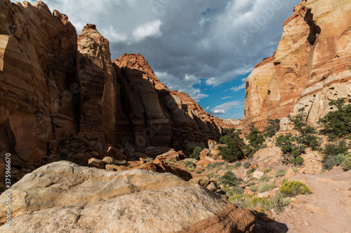 Obraz premium The Red Sandstone Cliffs Along The Waterpocket Fold at The Entrance Into Cohab Canyon, Capitol Reef National Park, Utah, USA