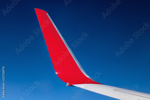 © milkovasa, Naklejka premium The red winglet on a wing of plane when a flight in a blue sky. Part of jet wing, close view.