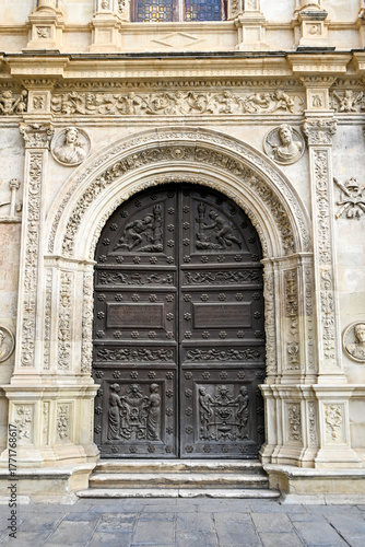 Fototapeta premium The renaissance wooden door with Latin inscriptions on the Plateresque facade...