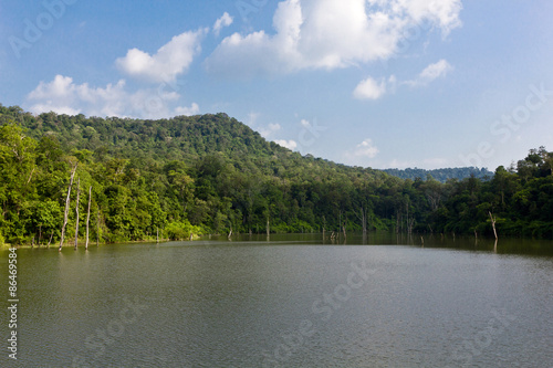 © AE.Panuwat Studio, Fototapeta premium The reservoir with blue sky, clouds, mountain and trees