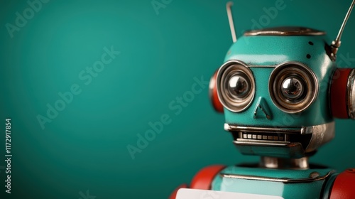 Fototapeta premium The retro robot features a unique design with expressive eyes and a lined...
