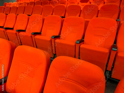 Fototapeta premium The rhythmic arrangement of the red fabric event hall chairs in their empty...