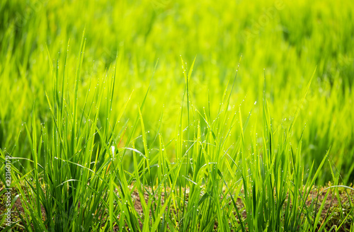 © boophuket, Obraz premium The rice fields background during the period of planting rice in the morning are wind-blowing and sunlight. In agriculture and environmental concepts.