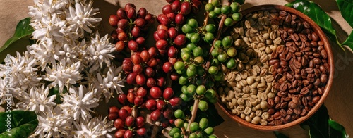 © Albi, Fototapeta premium The rich variety of coffee beans and blossoms in a beautiful arrangement
