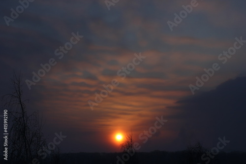 Fototapeta premium the rising sun on the horizon with colored wavy clouds