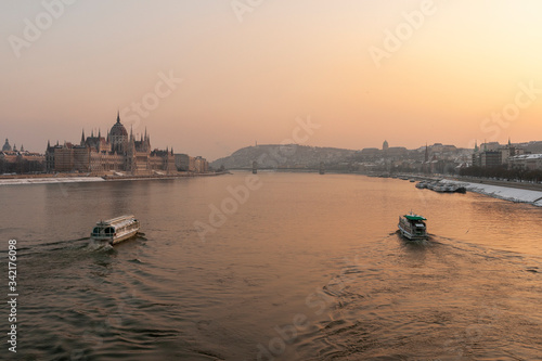 Naklejka premium The river Danube on a cold winter day with the Hungarian Parliament building...