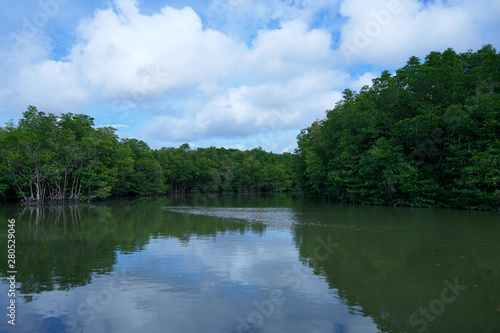 Fototapeta premium The river in the middle of the mangrove forest with blue sky and beautiful...