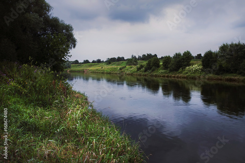 © v_ridjin, Fototapeta premium The river is dark blue with lush green grass and trees along the banks