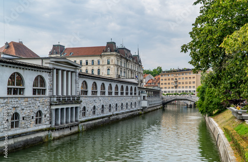 Naklejka premium The river Ljubljanica in Ljubljana, Slovenia with traditional Slovenian houses