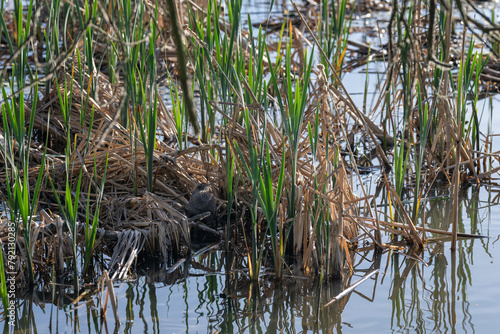 Fototapeta premium The river nutria bites off dry parts of the reeds.