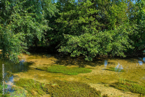 © dragoncello, Naklejka premium The River Una as it passes through central Bihac in Una-Sana Canton, Federation of Bosnia and Herzegovina