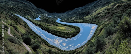© ckybe, Fototapeta premium The river winds through the valley mirroring an unfolding journey.