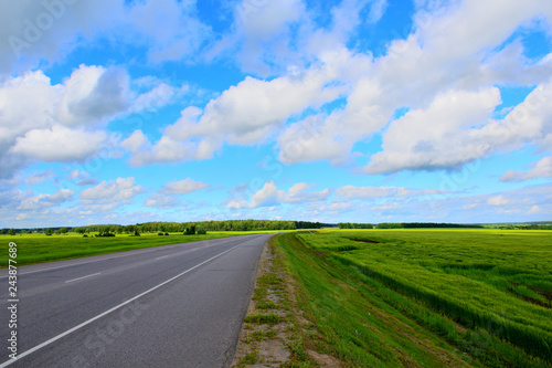 © Vladimir, Fototapeta premium The road between green meadows on a background of bright blue sky