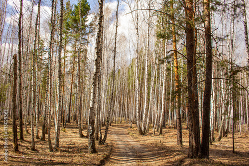 Fototapeta premium The road between the birches. A dirt road runs between pine and birch trees in a spring forest.