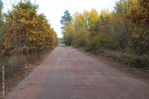 © Jeannie , Obraz premium the road in the autumn forest, multi-colored trees, yellowed leaves, October