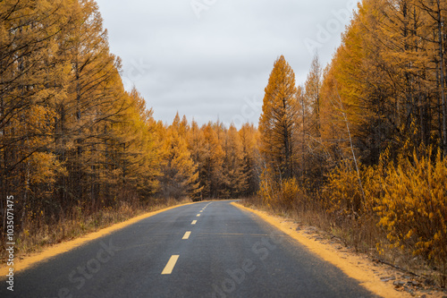 © chendongshan, Fototapeta premium The road in the forest with yellow larch on both sides of the road