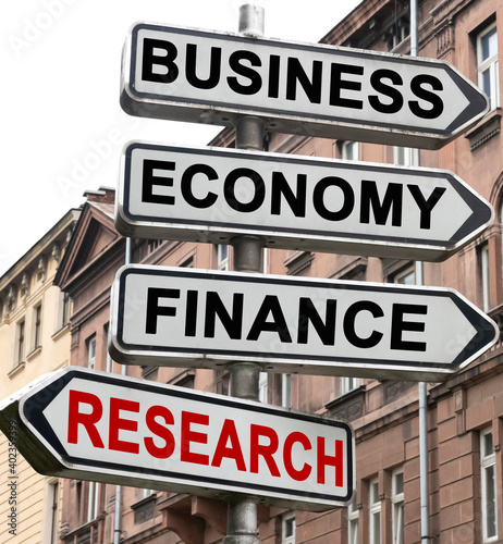 © Dzmitry, Obraz premium The road indicator on the arrows of which is written - business, economics, finance and RESEARCH