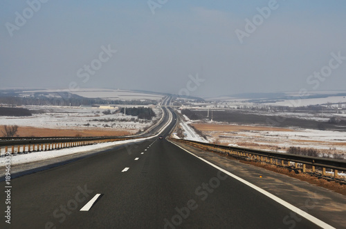 Fototapeta premium The road is going off into the distance among the winter fields and hills. Endless expanse.