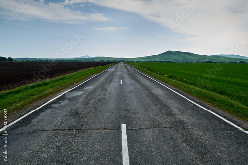© Aleksandr, Fototapeta premium The road leading into the distance to the mountains after the rain.