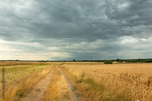 Fototapeta premium The road through fields with grain and dark clouds in the sky