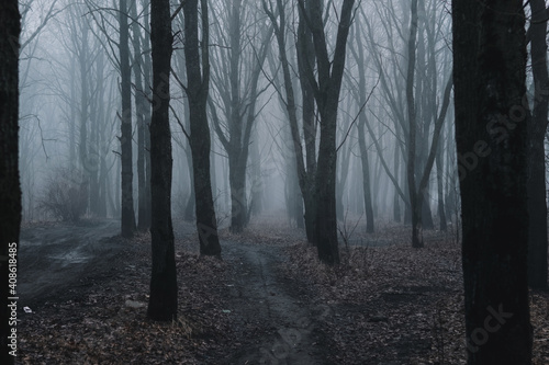Fototapeta premium The road through the dark misty forest in the evening. Fabulous mystical landscape