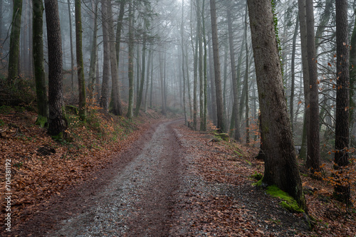 © YARphotographer, Fototapeta premium The road through the forest in the fog