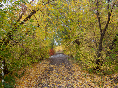 © Илья Юрукин, Fototapeta premium The road through the old concrete bridge through the autumn forest.