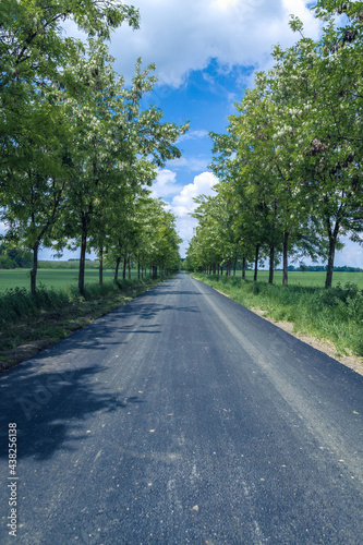 © Bojan, Obraz premium The road through the tree line. The road on a sunny day with clouds.