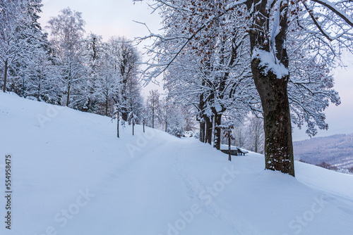 Fototapeta premium The road through the winter, snowy forest. Trees in the snow. Snow hidden path