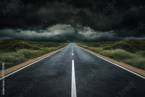 Fototapeta premium The Road to Storm- A dramatic scene of a long, winding road leading into a dark, menacing s_1(309). Beautiful simple AI generated image