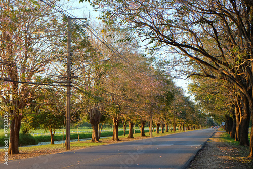 Fototapeta premium The road with Tabebuia trees on both left and right side with morning sunlight