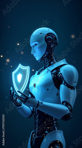 Naklejka premium The robot holds a glowing shield symbolizing cybersecurity and protection