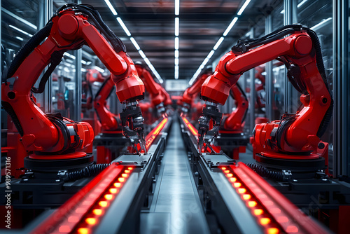 © Prasanth, Fototapeta premium The robotic assembly line with red robotic arms is advanced and ensures automated production processes for maximum efficiency in the factory setting