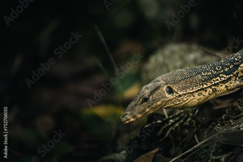 © CSJ STUDIO, Fototapeta premium the rocky ambush a young water monitor lizard in the dark shadows