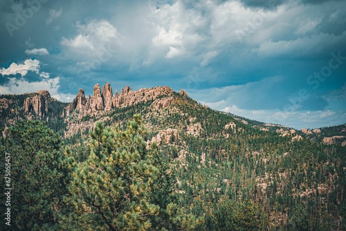 Fototapeta premium the rocky mountains covered in pine trees under a cloudy sky