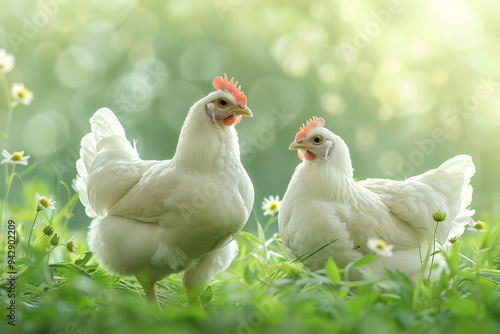 © pakoefoto, Fototapeta premium The roosters and hens in the rice field.
