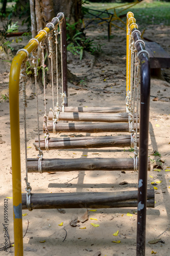 Fototapeta premium the rope and wood ladder at playground in Thailand.