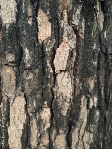 © Ilhamdh, Obraz premium The rough, striped texture of tree bark, with deep vertical patterns and natural cracks, is perfect for backgrounds, natural textures, or design elements that require an organic, rustic touch.